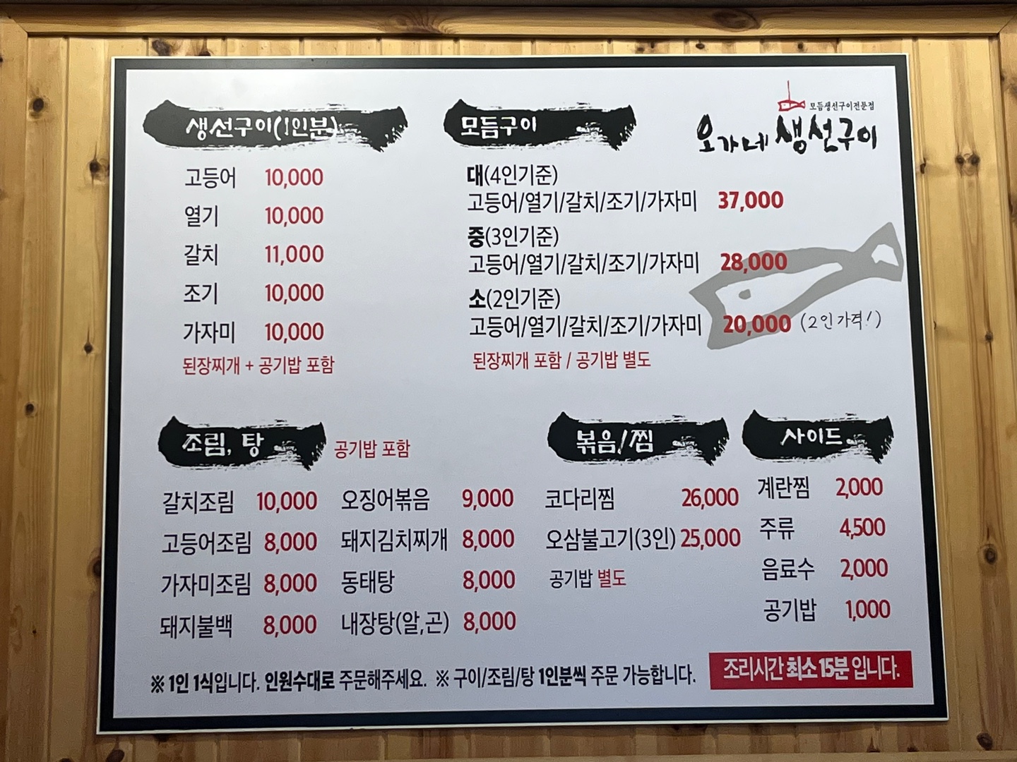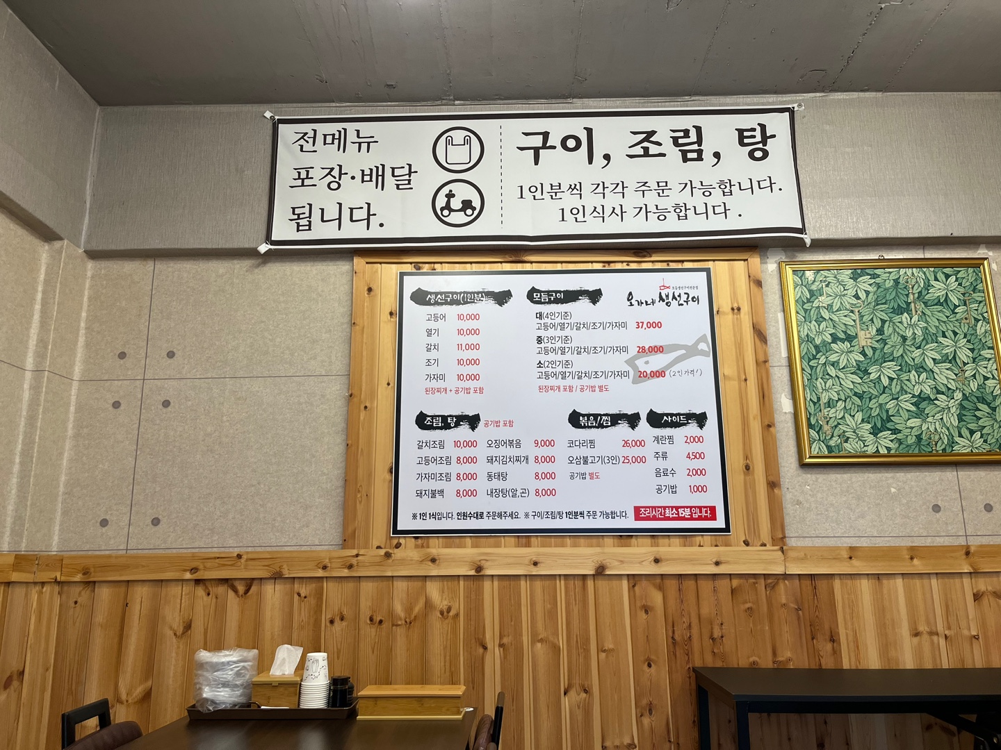 구이는 고등어, 열기, 갈치, 조기, 가자미가 있고 된장찌개와 공기밥은 기본으로 나온다.