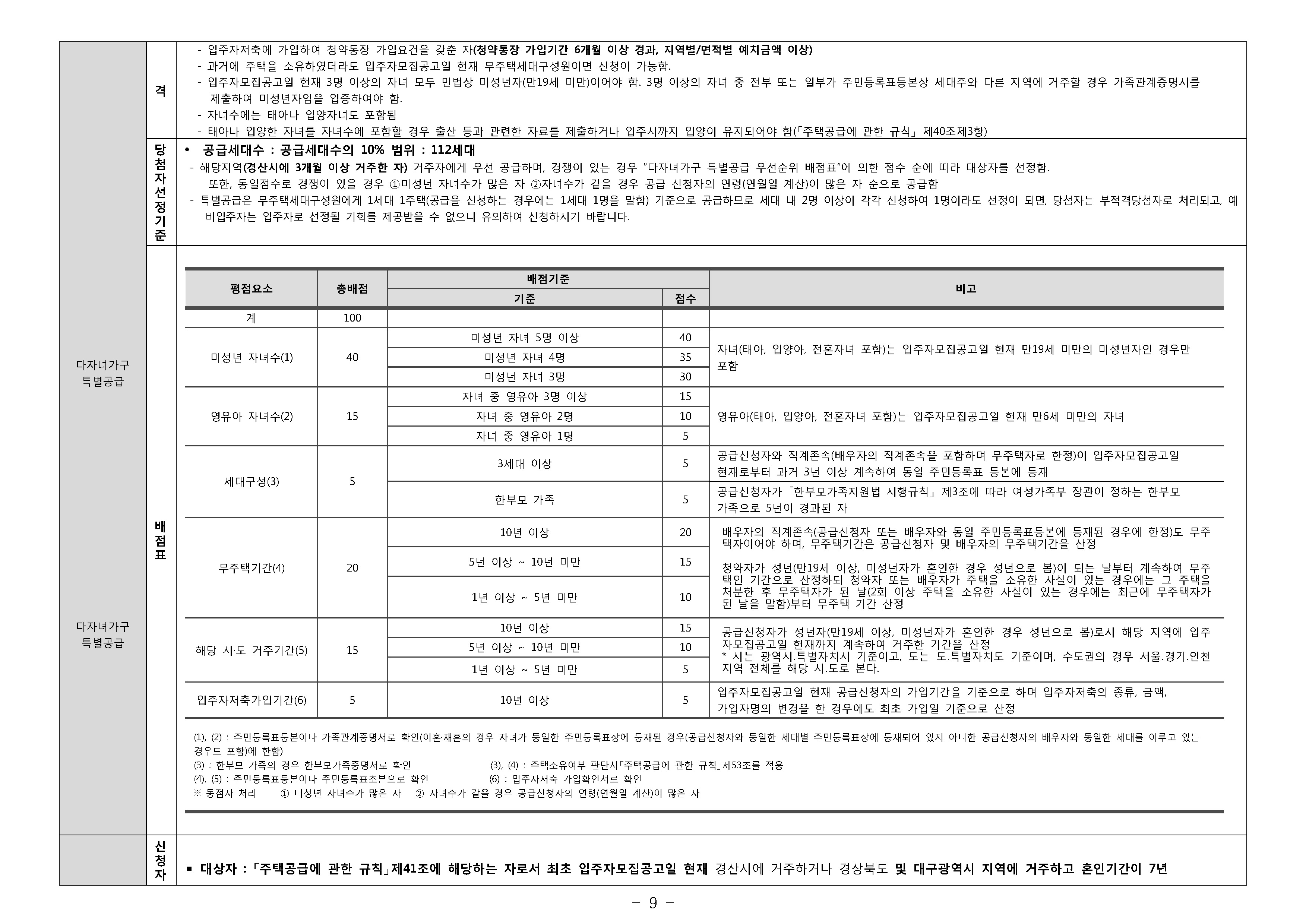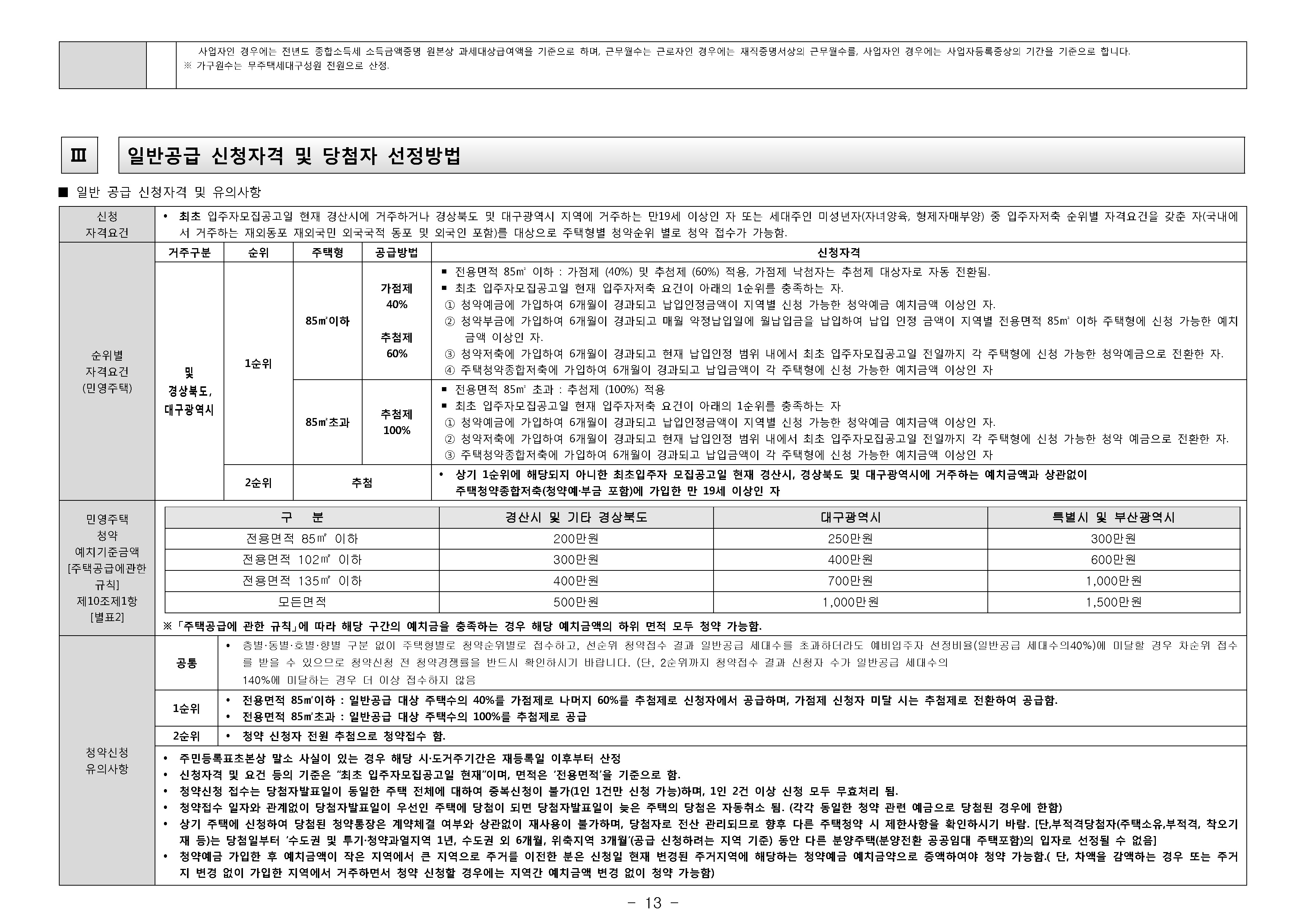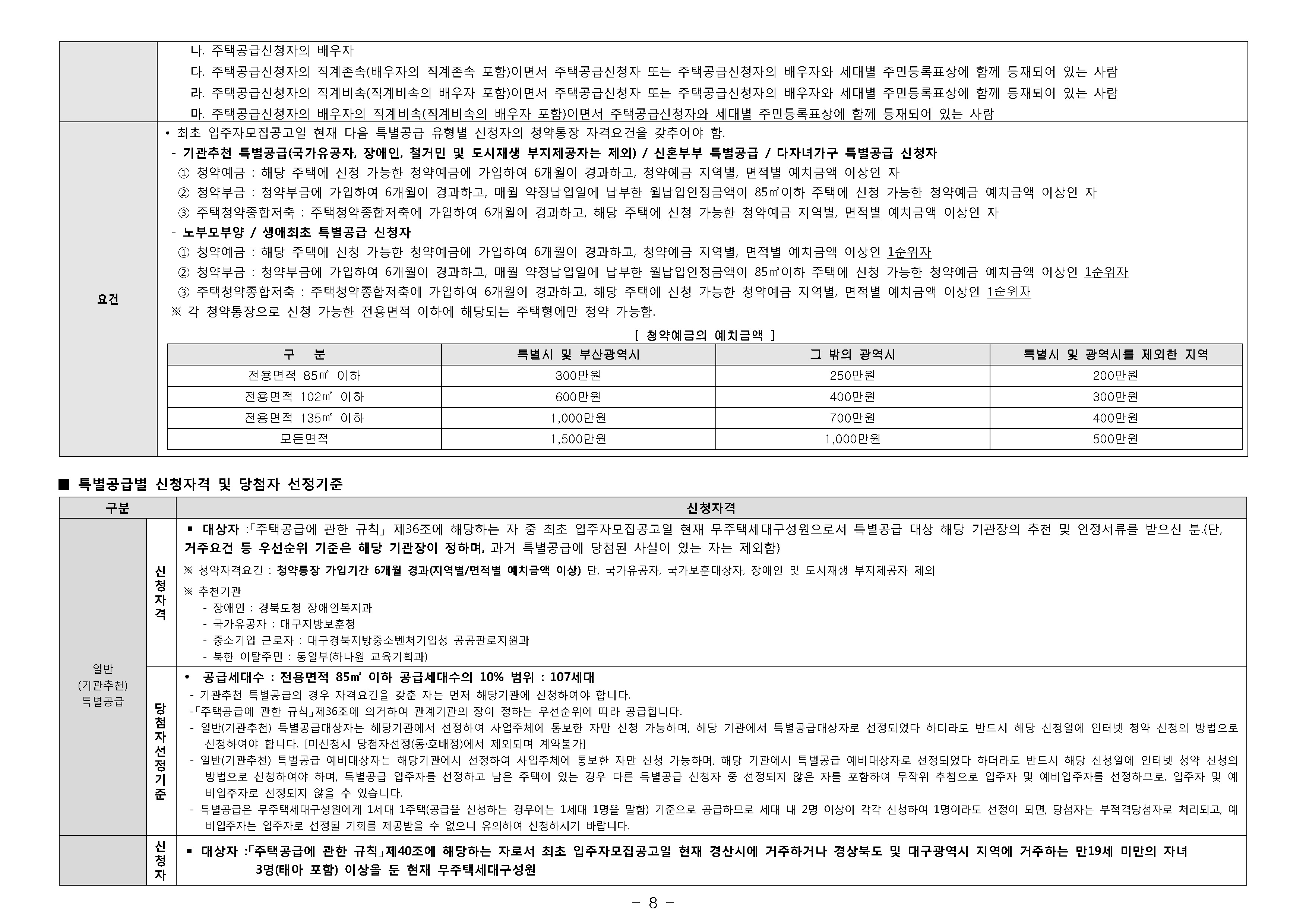 경상북도 및 경산시 거주고객기준 청약 예치금 안내