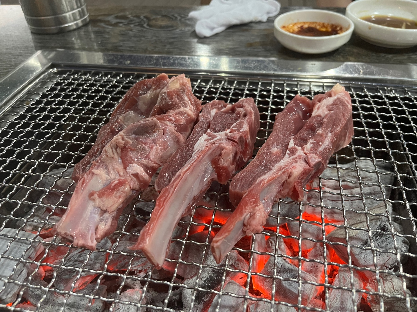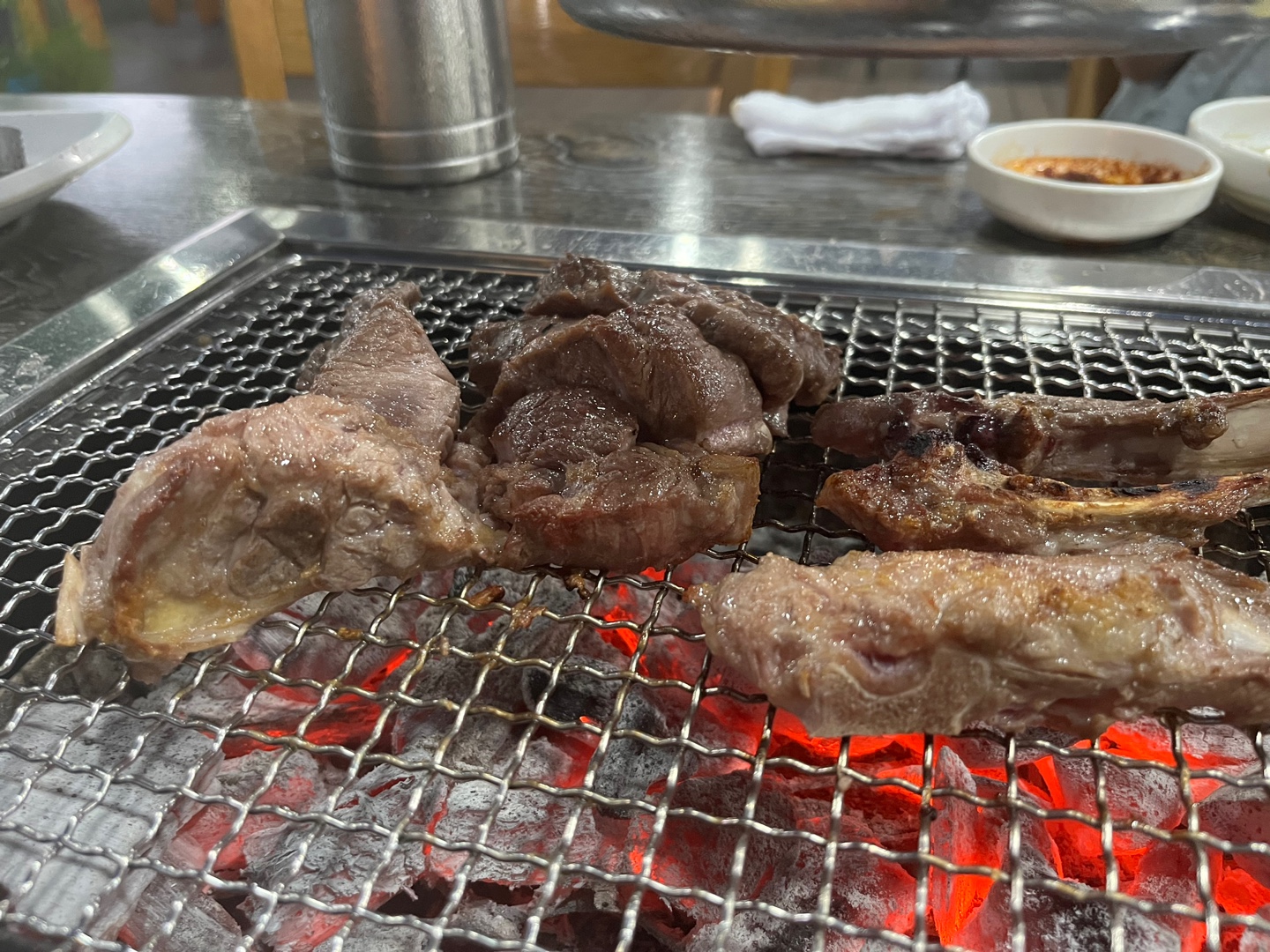 찍어 먹는 향신료를 주는데 외국에서 먹었던 향신료 소스와 거의 같은 맛이었습니다. 아마 술안주로 먹으면 더 맛있었을 것 같네요. 중간중간 숯은 계속 보충해 주셨어요. 숯불이라 그런지 좀 뜨거운 건 감안해야 할 것 같아요.