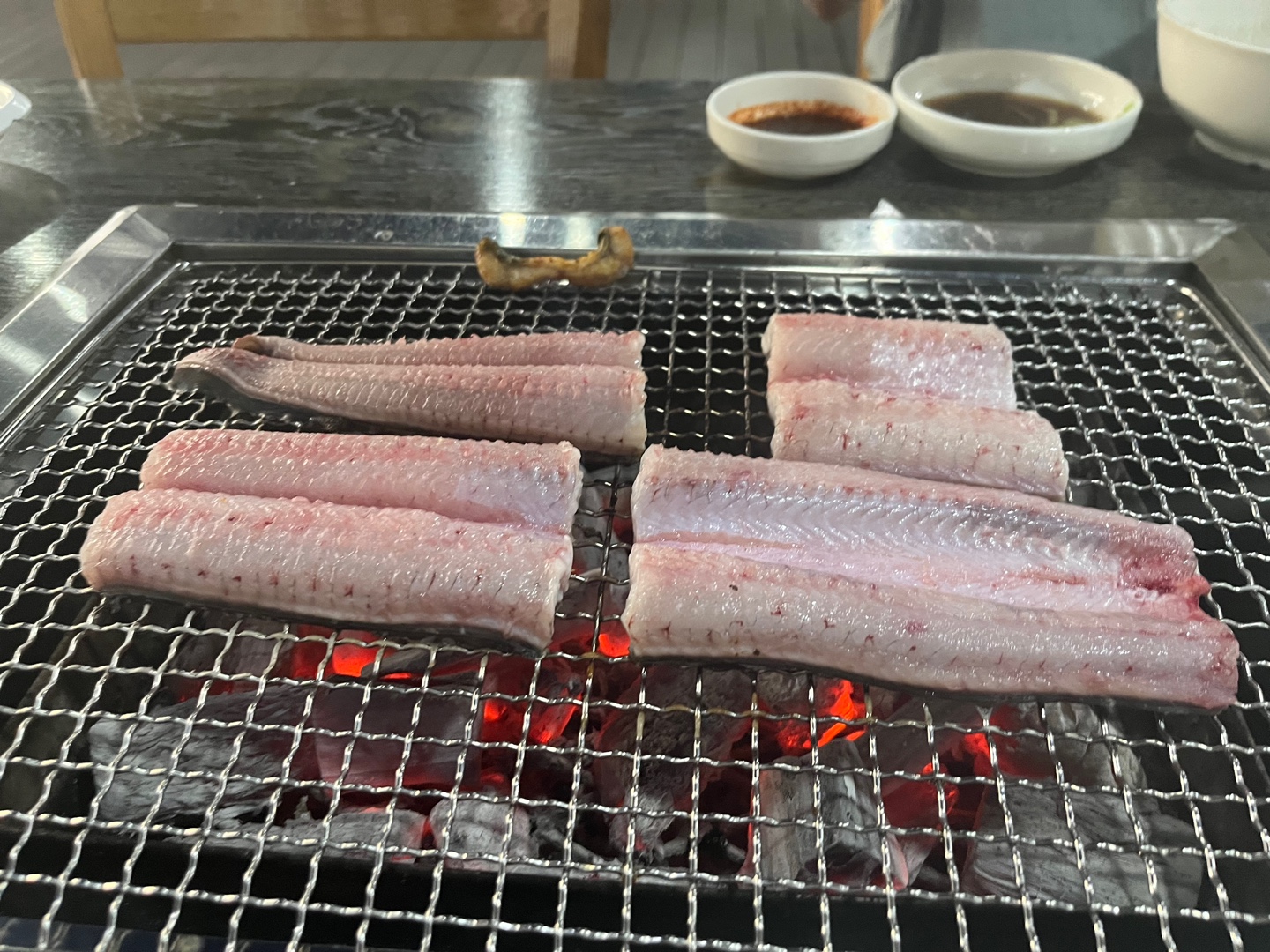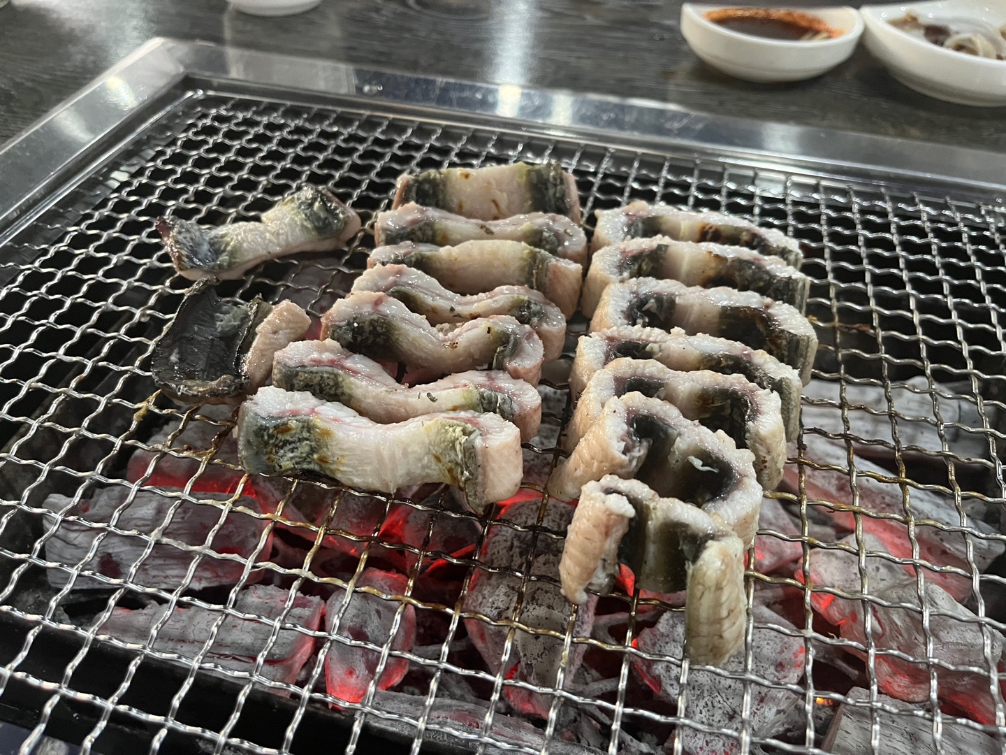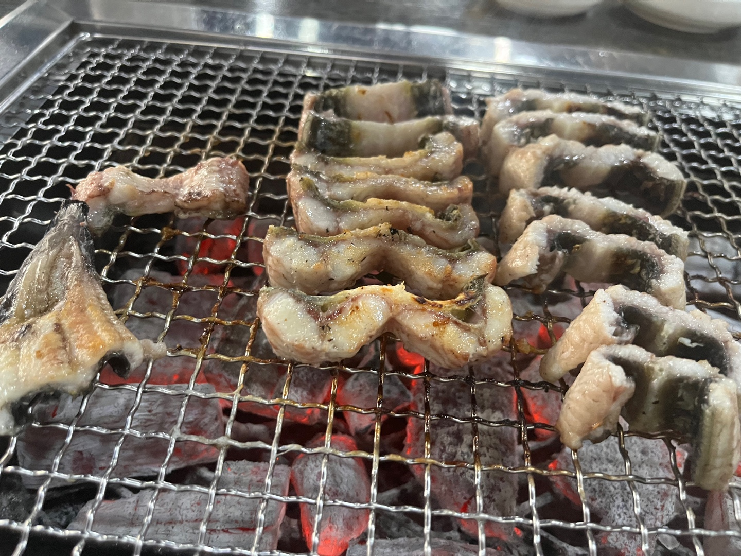 맨 오른쪽에 양념장인데 저기에 생강을 넣고 장어를 찍어 먹으면 맛있더라고요. 둘이서 700g 정도를 먹었는데 이 날은 양고기가 또 먹고 싶어서 양고기를 400g 시켰습니다. 양고기까지 먹으니 배가 아주 부르더라고요. 양고기 말고 장어를 조금 더 먹을 걸 하는 후회가 들었습니다. 맛있긴 한데 배가 불러서 약간 후회되더라고요.