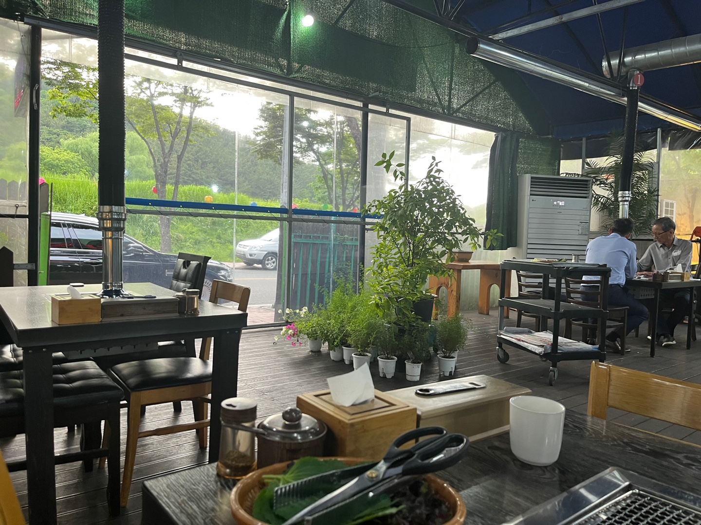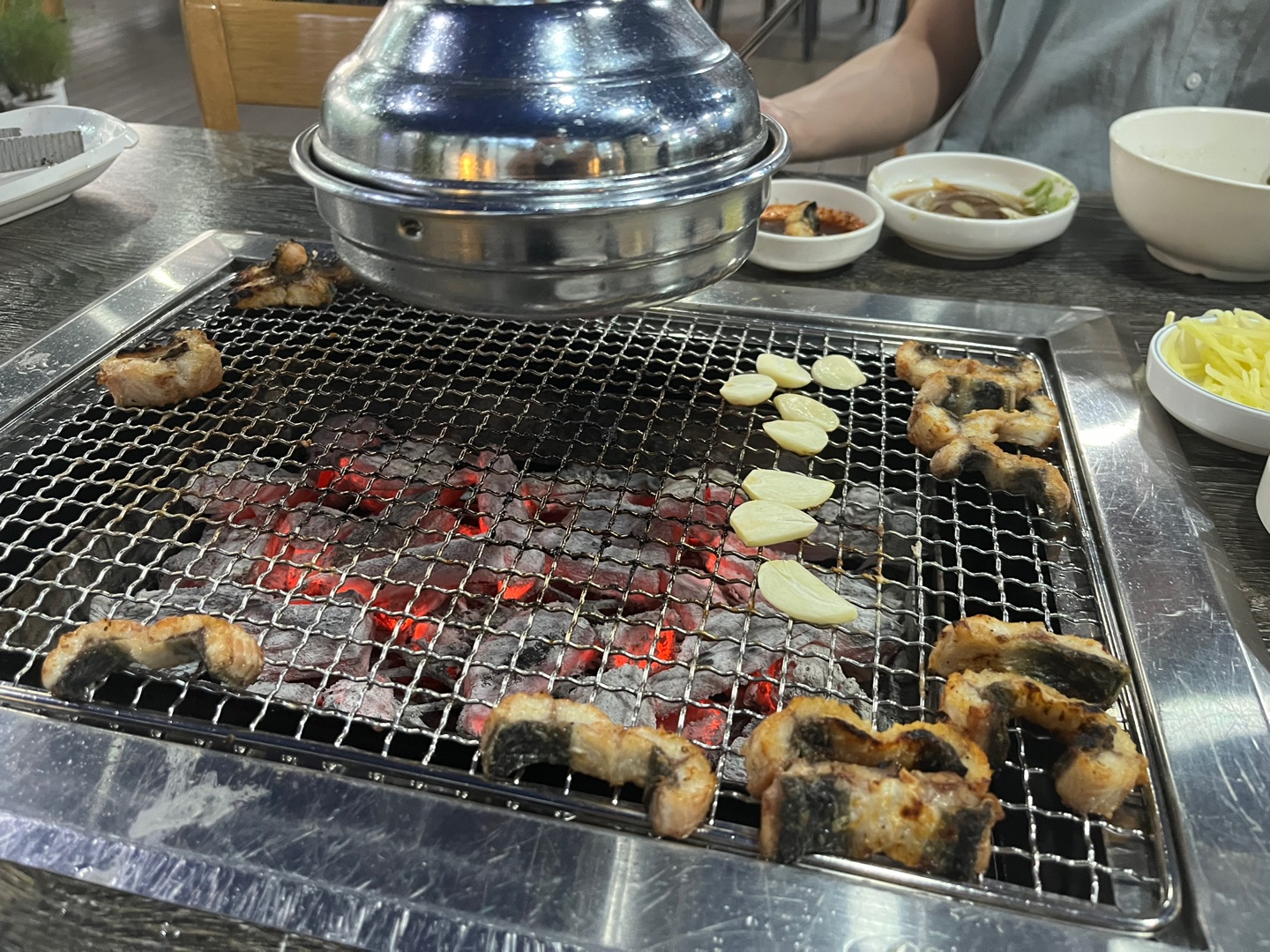 이렇게 약간 비닐하우스 감성 같기도 하고 야외 같으면서 실내라서 분위기가 참 좋았습니다. 장어는 직원분들이 직접 구워 주십니다. 저희는 남 1, 여 1 이렇게 갔었는데 일단 장어 300g을 시켰습니다. 양은 아래와 같이 나오고 미역국도 나옵니다.