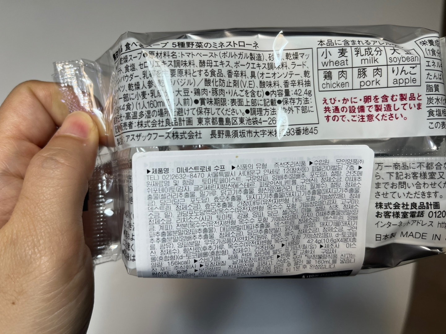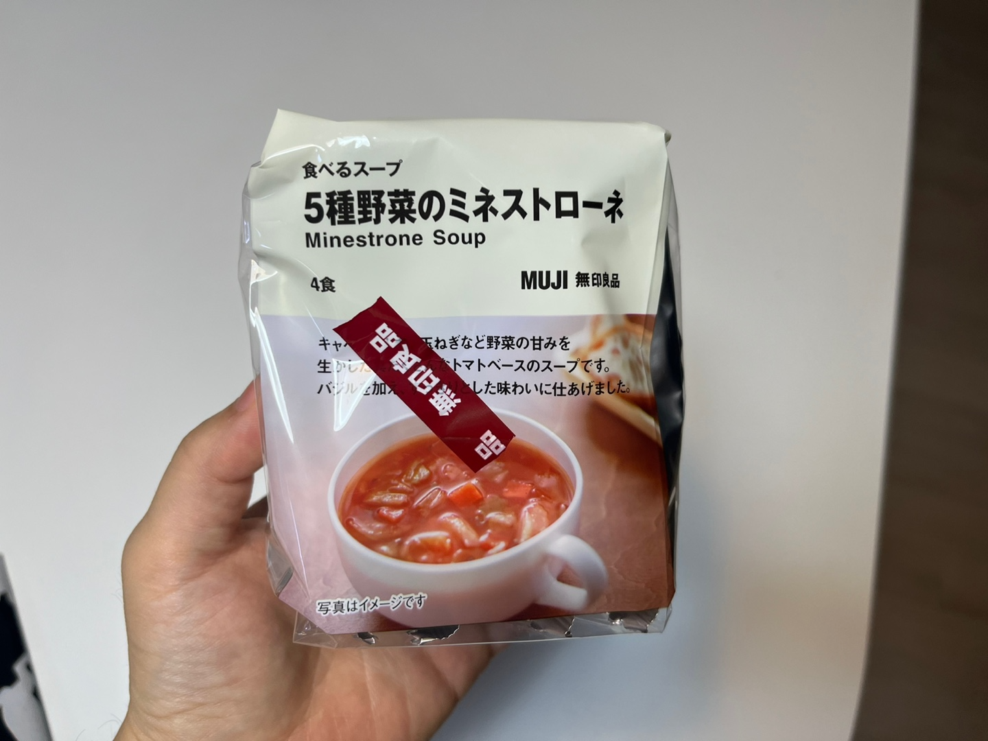 토마토, 양파, 콩, 파슬리, 마늘, 올리브 오일 등 다양한 식재료로 만들어져 있다. 미네스트로네는 일반적으로 채소, 콩, 파스타 등을 함께 끓여 만든 스프로, 무인양품 미네스트로네 수프 역시 이같은 식재료를 사용해서 부드럽고 진한 맛이다.