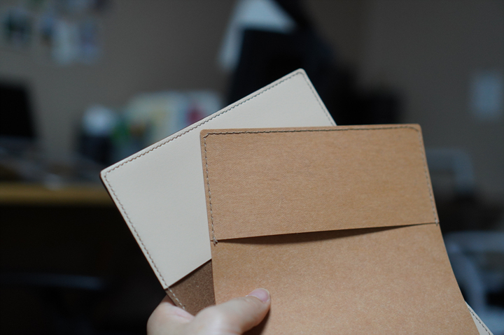 아래 사진은 기존의 가죽 커버와 크라프트 원단 커버의 비교샷입니다.