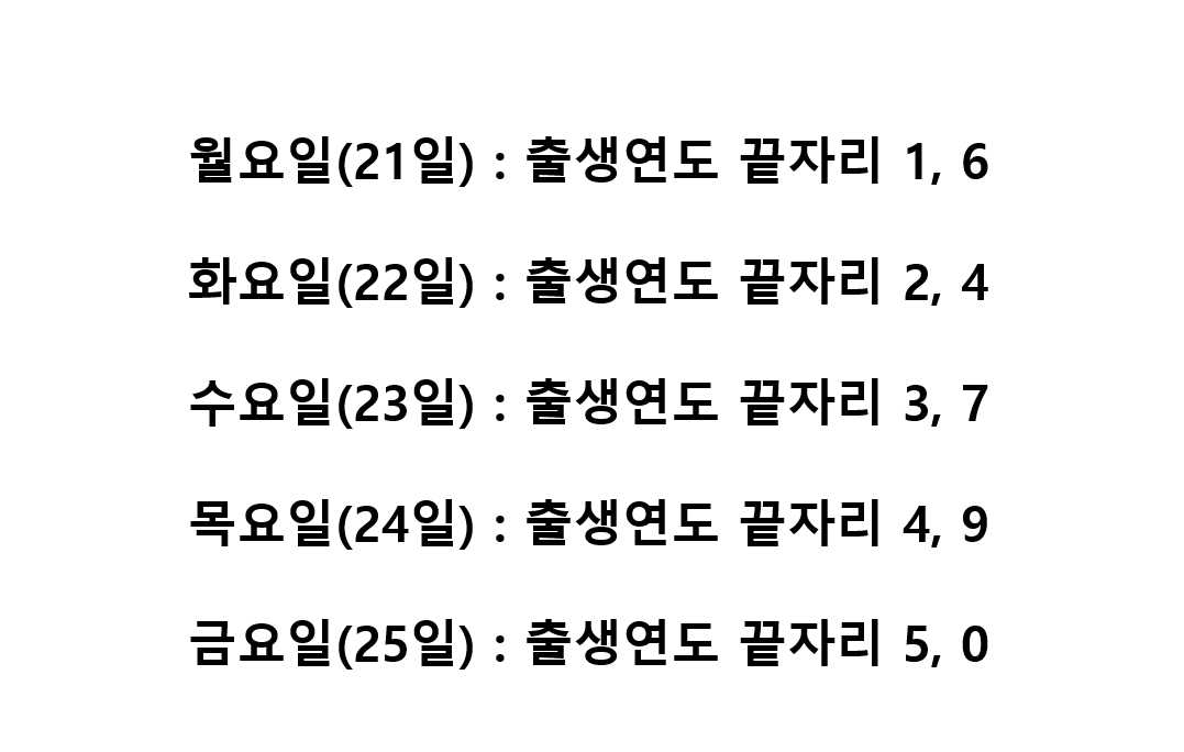 1,6 - 월 / 2,7 - 화 / 3,8 - 수 / 4,9 - 목 / 5,0 - 금