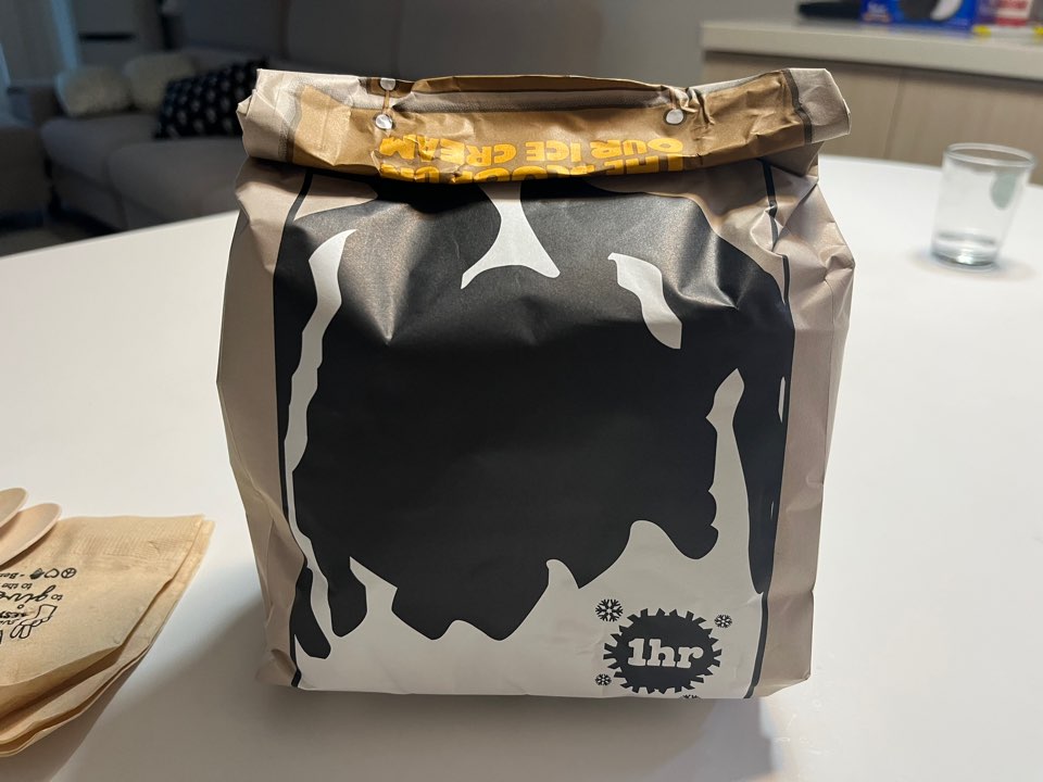 종이 가방에 내부는 아주 얇은 은박지 같은 포장이 되어있다. 안에 물로 된 아이스팩이 하나 있었다. 1시간 정도 보냉이 되는 것 같았다. 여기 반야월점은 리뷰이벤트로 모캄보 아이스크림을 제공하고 있었다.