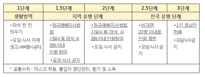 ○ 1.5단계부터 해당 권역에서 종교시설 주관의 모임·식사가 금지되며, 정규예배·미사·법회·시일식 등은 좌석 수의
