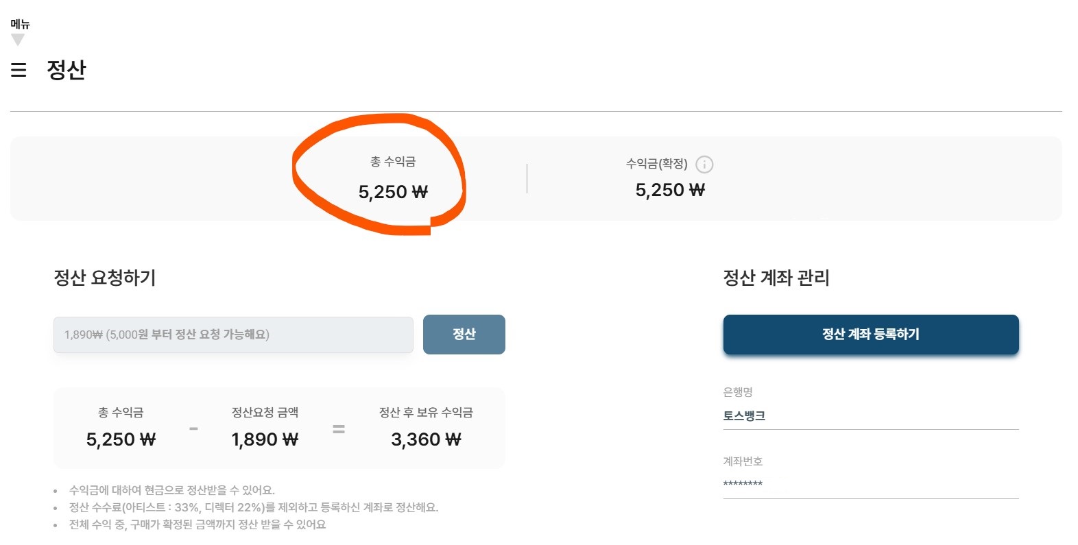 11월 1일~5일 까지 총 판매금액은 5,250원, 수수료는 아직 등급이 낮아서 33% 인데 디렉터 등급이 되면 22%로 낮아진다.