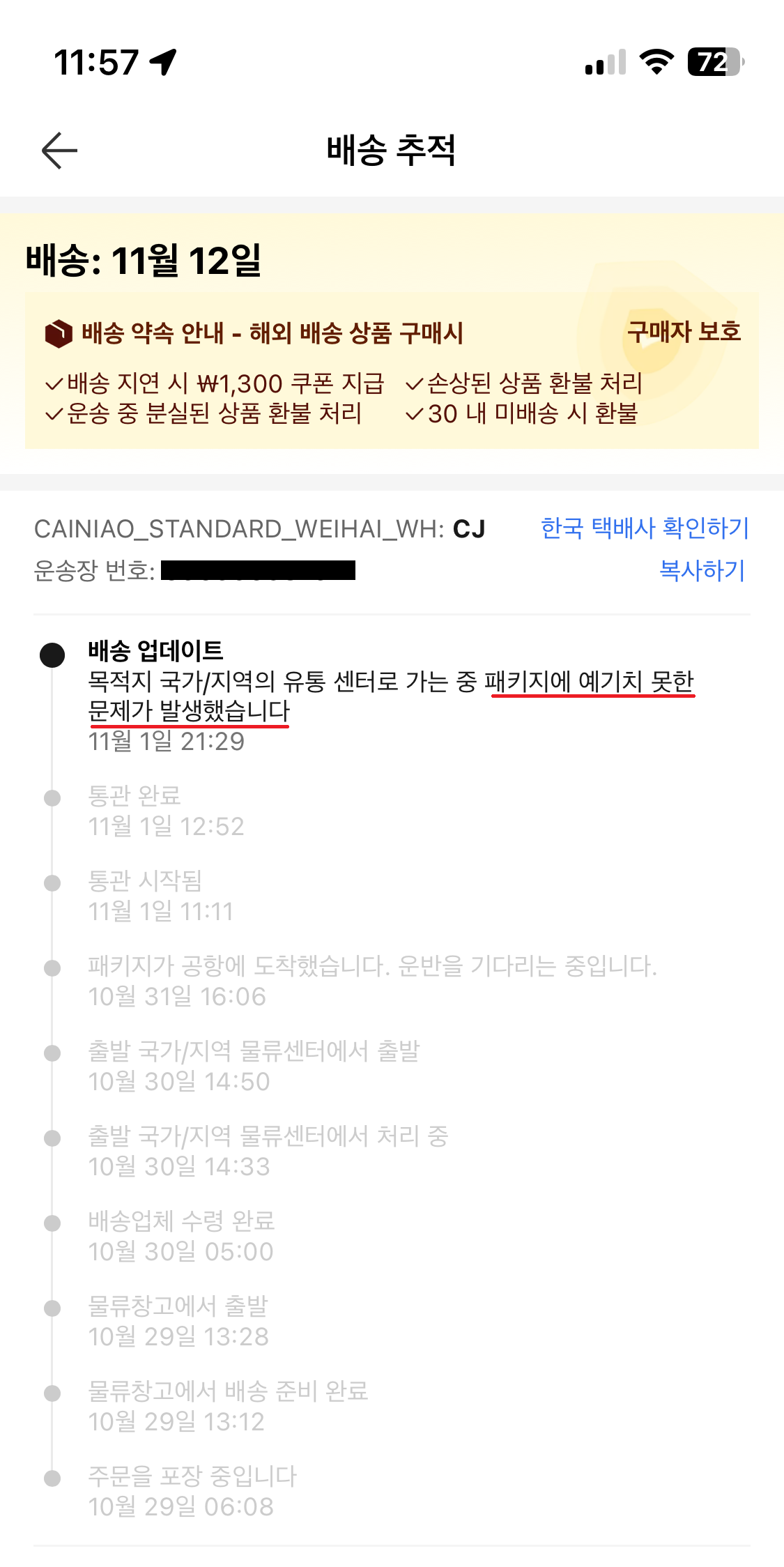 "목적지 국가/지역의 유통 센터로 가는 중 패키지에 예기치 못한 문제가 발생했습니다."