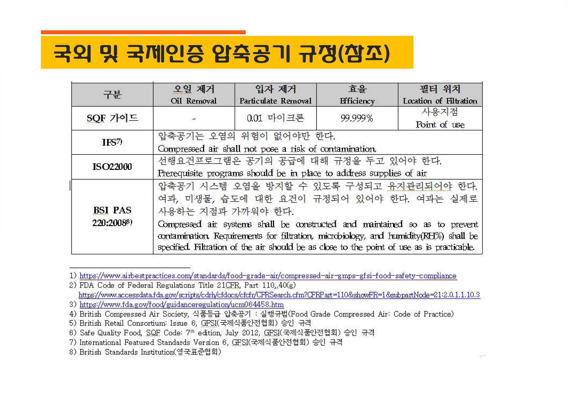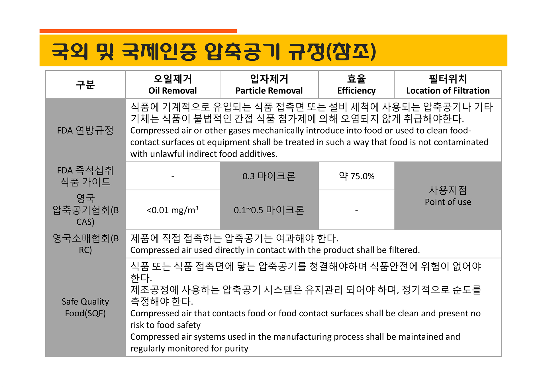 * 식품과 직접 접촉하는 압축공기의 경우