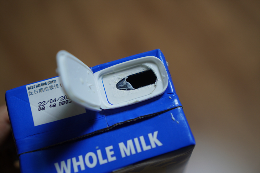 뭔가 깔끔하게 컵에 따르려고 했지만 저 뚜껑 부위에 몇 방울의 우유가 맺힌다.