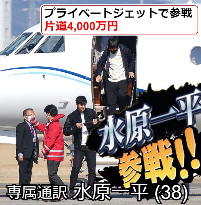 오타니가 편도 4억의 전세기를 타고 일본으로 왔다. 일본 야구 대표팀내 최고 에이스인 오타니 쇼헤이가 WBC 출전때문에 미국에서 일본으로 전세기를 타고 이동했다. 오타니는 미국 애리조나에서 출발해서 도쿄 하네다 공항에 도착했으며, 이 전세기는 캐나다 봄바디어사의 Global 5000 기종이다. 비행기 가격은 대당 1000만 달러이다. 오타니 개인 소유는 아니며 FA가 되면 개인 전용기를 이용 할 수도 있다.