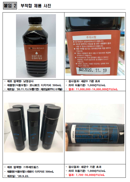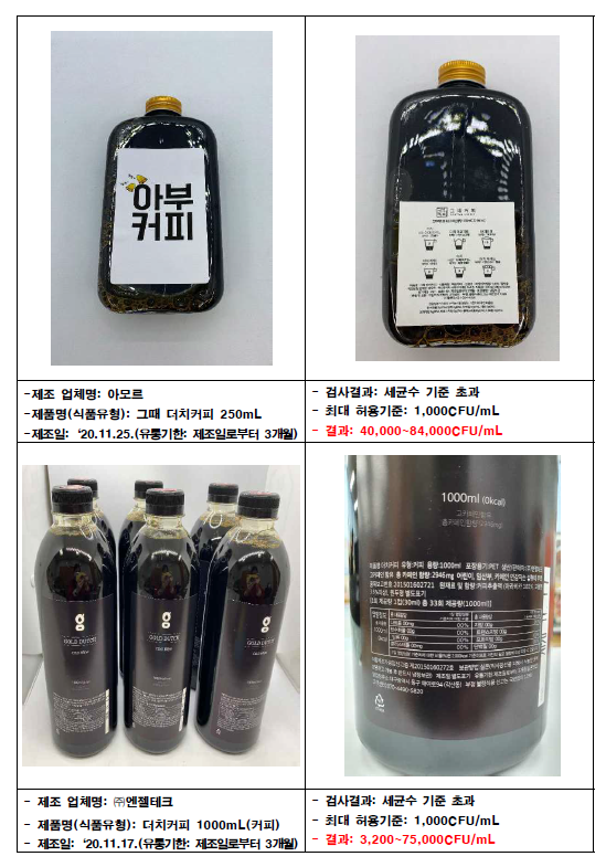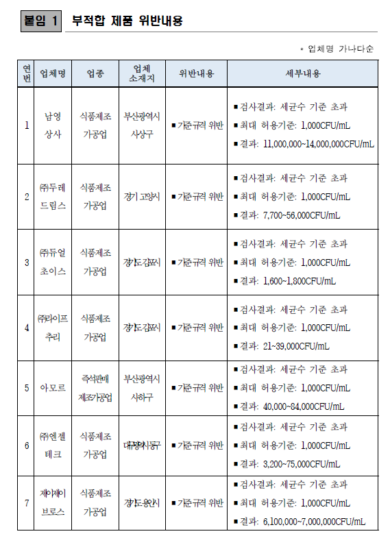 이렇게 7개 업체였다. 상당히 큰 폭으로 세균수 초과된 업체들도 보인다.