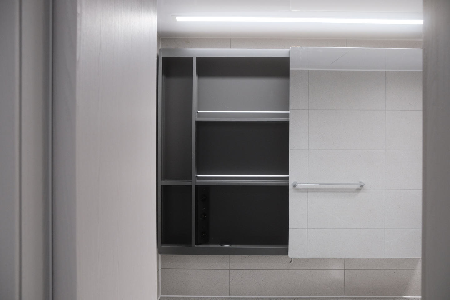 저 싱크대 위에 수납장은 손으로 터치하면 열리고 터치하면 닫히는 방식입니다.