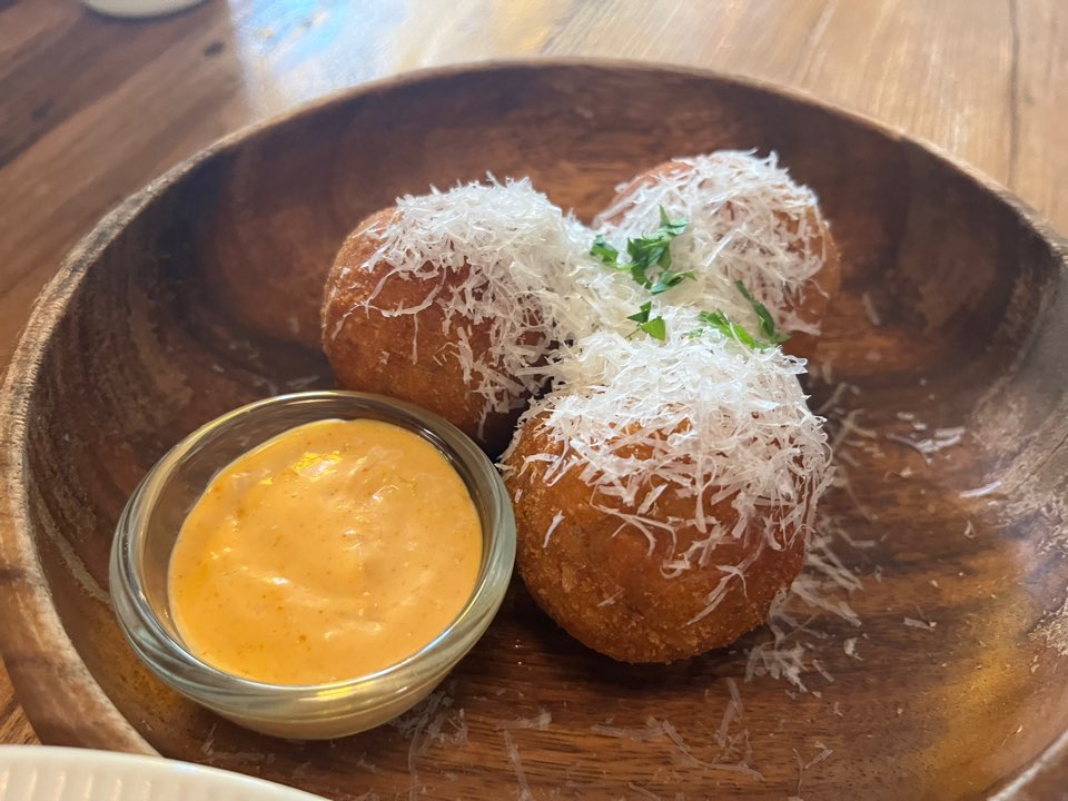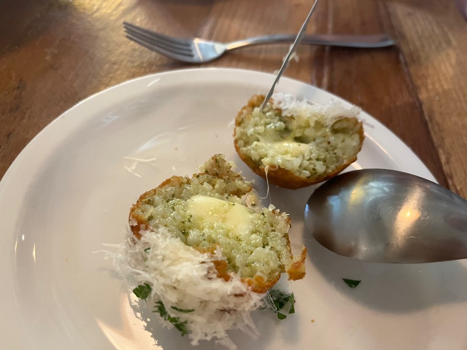 이건 바질아란치니, 가격은 9,900 원이고 자르면 안에 밥이 들어있다. 양은 아주 작은 편. 바질 아란치니는 이탈리아의 바질리카타 지방의 전통음식이다. 보통 쌀과 다양한 재료로 만든 공 형태로 튀겨낸 음식이다. 외부는 바삭하고 내부는 부드러운 텍스쳐이다. 주로 안티파스토 요리로 제공되고 주전부리나 간식으로 먹는다. 가족 모임이나 축제에서도 자주 볼 수 있다.
