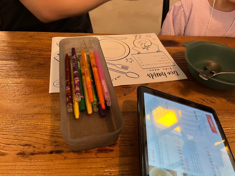 주문은 패드로 하는 방식이다. 키즈 메뉴도 있고 아이들이 산만하지 않도록 그림을 그릴 수 있도록 종이와 색연필을 가져다 주셨다. 직원분들이 굉장히 친절하셨다. 그림은 음식들과 식기류 같은것들을 색칠 할 수 있도록 되어 있었다.